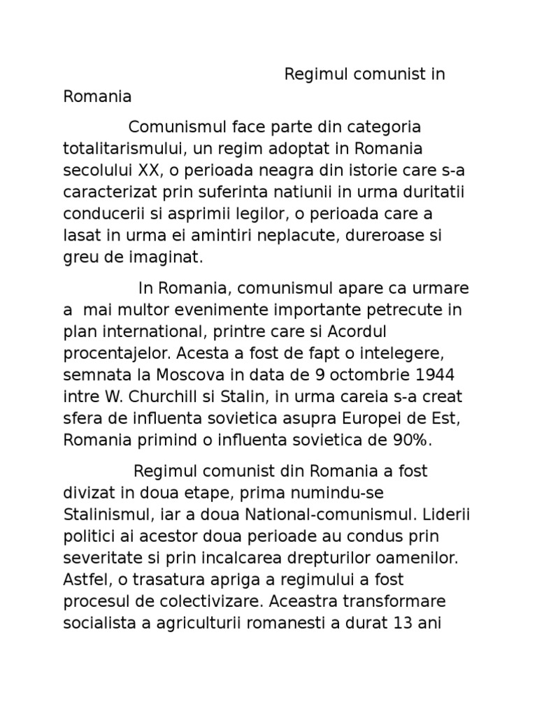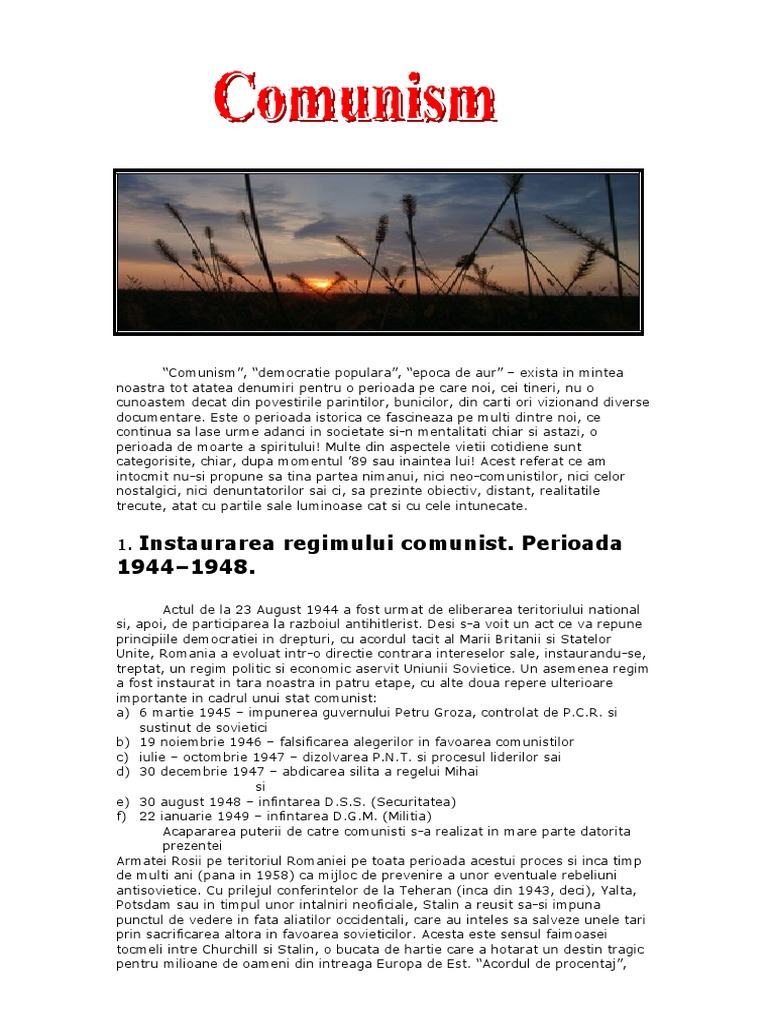 Romania comunista eseu. După încheierea celui de al doilea război mondial uniunea sovietică. Referatul despre comunismul în românia dezbate pe larg această temă oferindu ți detalii utile și interesante care te vor ajuta să aprofundezi mai bine subiectul. Adeverință eliberată de către studioul cinematografic bucurești lui radu coroamă student al facultății de geologie pentru motivarea absențelor din zilele de 5 și 6 aprilie 1965 când acesta a participat în calitate de actor la realizarea filmului la porțile pământului. îşi măreşte numărul de membri dezvoltă un discurs politic demagogic şi populist în care termeni ca dreptatea socială şi.